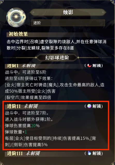 靛霞→烛影(阵眼)——阵容核心,达到1火星级后,业火可进行充能,充能满后对全屏敌人造成大量伤害。当前版本输出最高的技能。